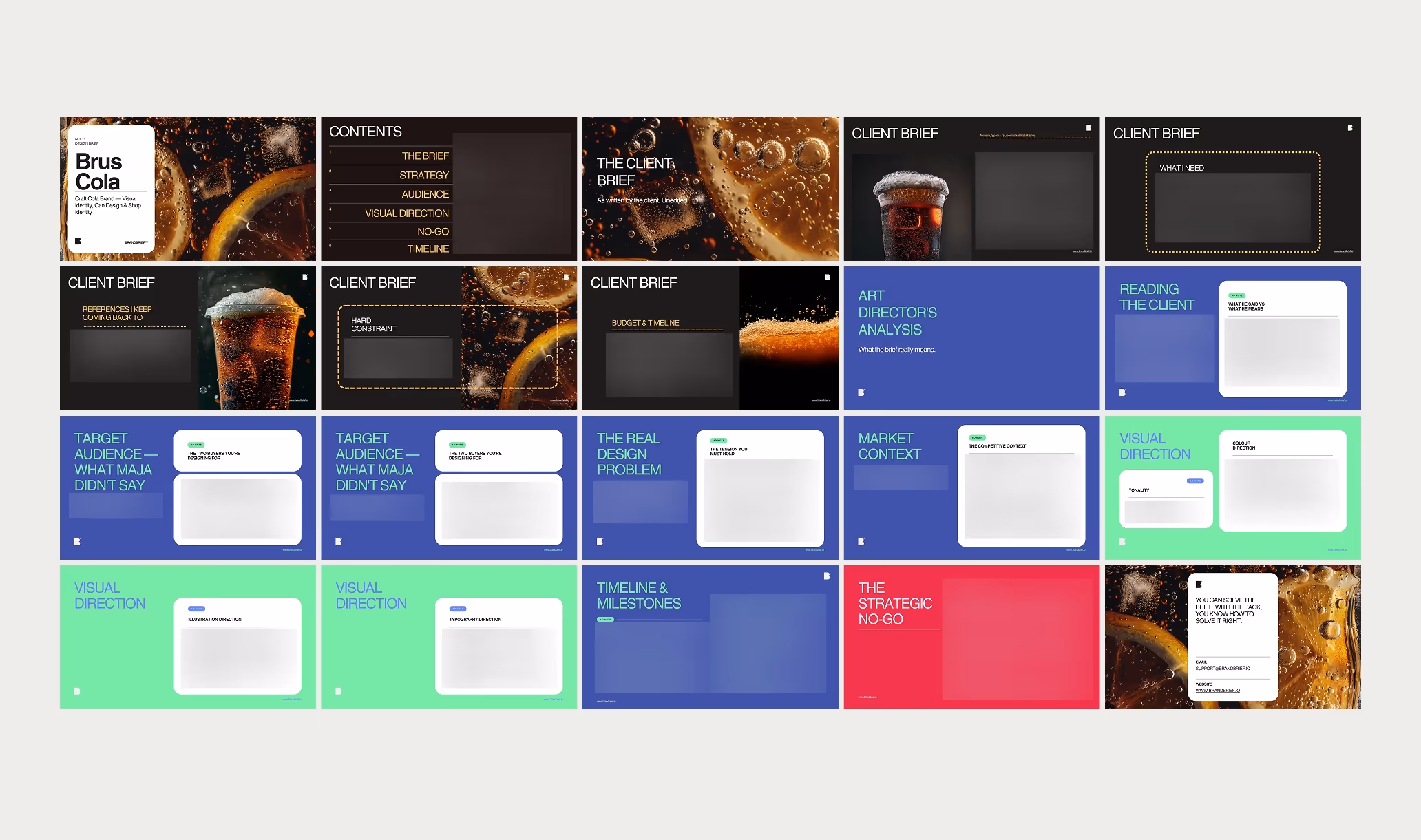 Each pack contains complete briefs, a raw client brief written in the client's own voice, and a full Art Director's Analysis that tells you what it actually means.